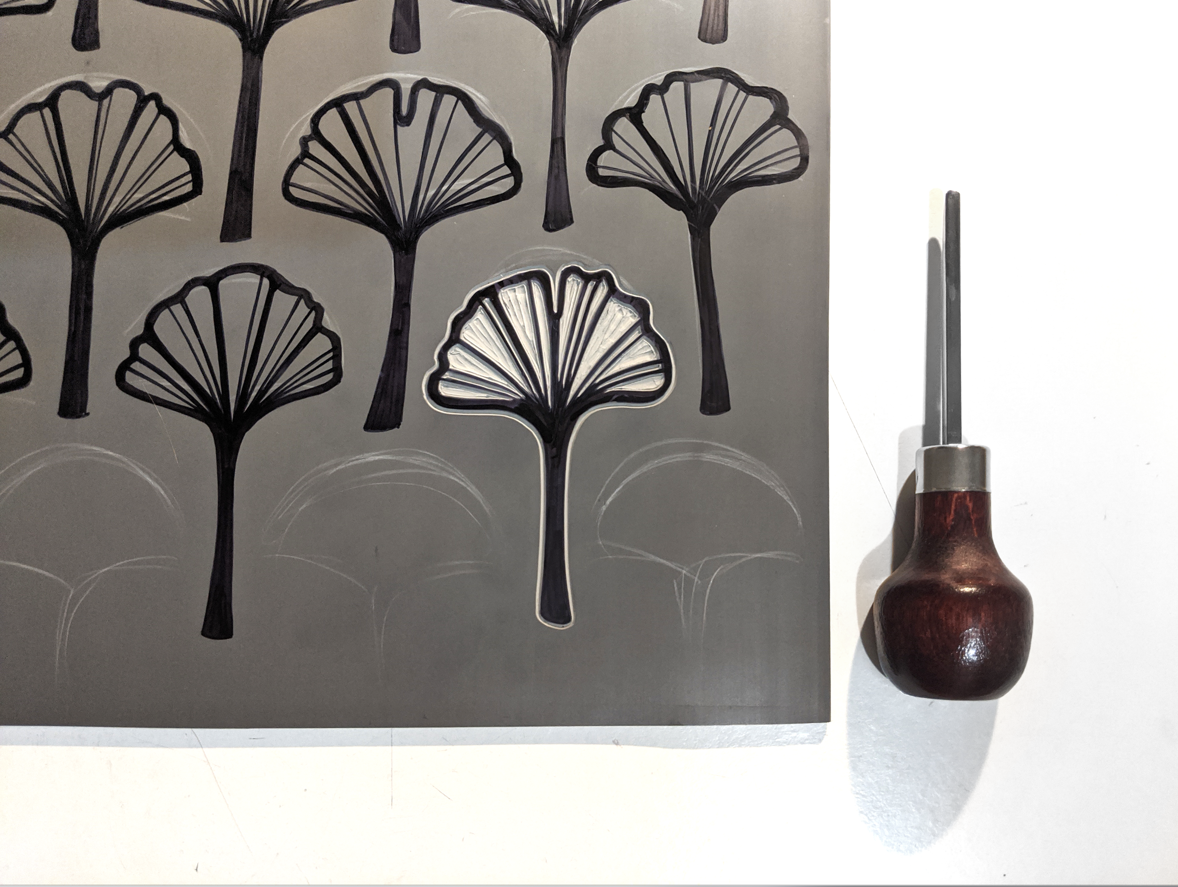 Lino-carving tools are used to create relief print surface