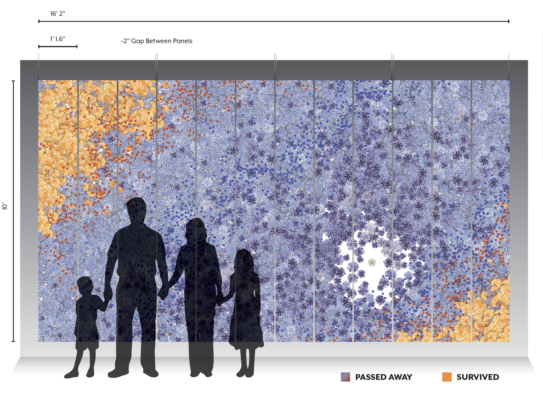 Twelve panels feature various hand-printed, cut flowers and leaves. Every flower or leaf symbolizes an individual who either passed away or survived pancreatic cancer in 2019. An estimated 56,770 adults in the US were diagnosed with pancreatic cancer in 2019, while only 11,020 were estimated to have survived beyond one year after diagnosis.
